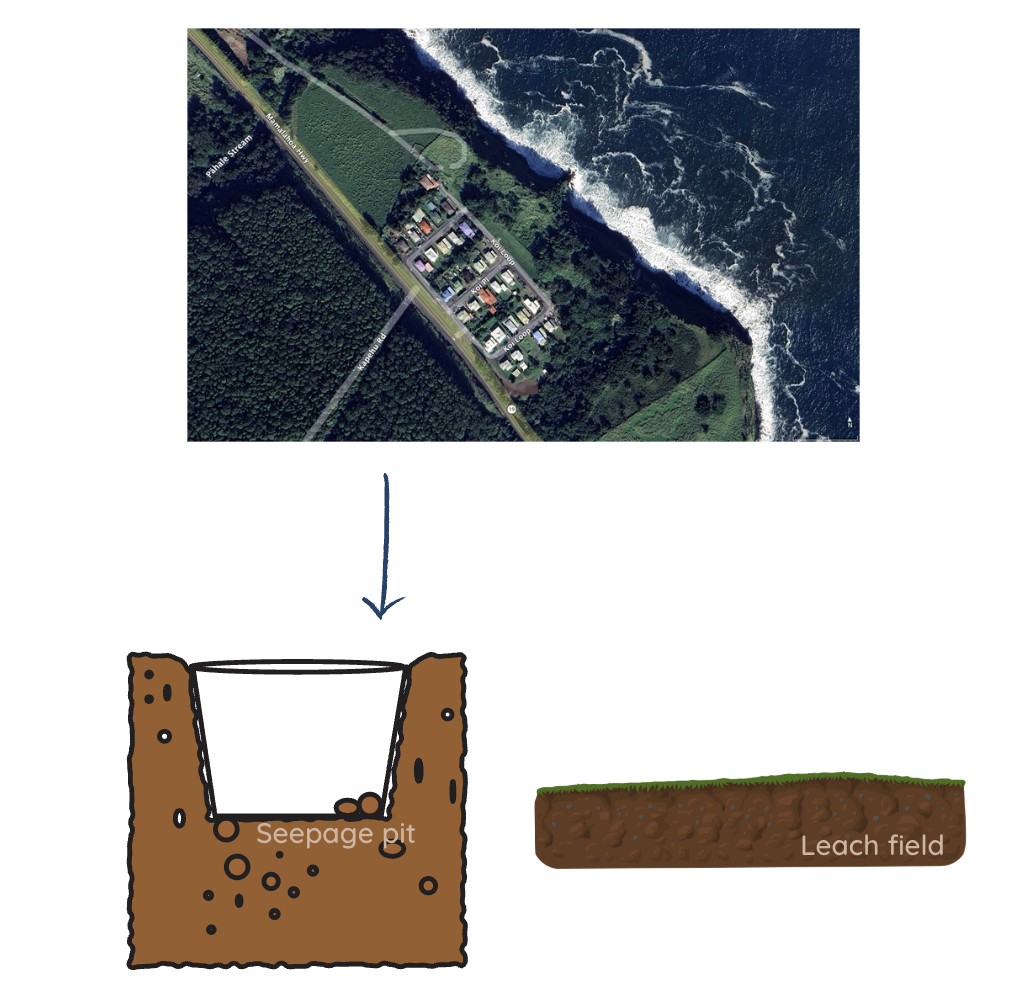 Hawaiʻi Island relies primarily on underground water sources for drinking water, which are all dependent on a combination of natural factors: northeast trades, high mountain ranges, and the island’s geological landscape. The NE tradewinds drive clouds filled with moisture inland, the mountain ranges (Mauna Kea, Mauna Loa, Kīlauea, Hualālai, and Kohala) capture and force moisture-filled clouds to higher elevations which result in rainfall on watershed areas. Hawaiʻi Islands volcanic landscape serves as a natural filter and underground storage system of water. Rainwater percolates into the earth, naturally filtered by porous volcanic rock, and stored in aquifers. The aquifers are an underground freshwater reservoir storage from which the Department of Water Supply sources water to deliver to homes. Water is pumped from a network of shafts, water tunnels, and many wells then conveyed to homes through mains, booster systems and reservoirs. Homes / areas that do not have access to the municipal water system rely on rainwater catchment systems or private groundwater wells to collect and supply water for household use.