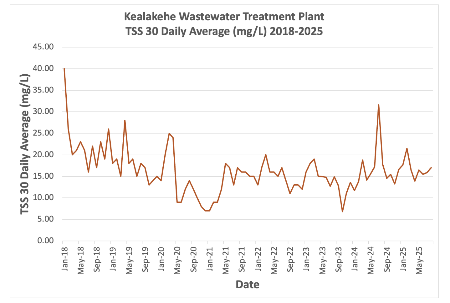 Date BOD5 30 Daily Average (mg/L) TSS 30 Daily Average (mg/L) Jan-18 11.00 40.00 Feb-18 9.00 26.00 Mar-18 9.00 20.00 Apr-18 8.00 21.00 May-18 13.00 23.00 Jun-18 9.00 21.00 Jul-18 11.00 16.00 Aug-18 13.00 22.00 Sep-18 17.00 17.00 Oct-18 11.00 23.00 Nov-18 12.00 19.00 Dec-18 13.00 26.00 Jan-19 14.00 18.00 Feb-19 18.00 19.00 Mar-19 11.00 15.00 Apr-19 23.00 28.00 May-19 20.00 18.00 Jun-19 0.00 19.00 Jul-19 17.00 15.00 Aug-19 5.00 18.00 Sep-19 8.00 17.00 Oct-19 10.00 13.00 Nov-19 7.00 14.00 Dec-19 11.00 15.00 Jan-20 8.00 14.00 Feb-20 10.00 20.00 Mar-20 10.00 25.00 Apr-20 9.00 24.00 May-20 8.00 9.00 Jun-20 6.00 9.00 Jul-20 8.00 12.00 Aug-20 8.00 14.00 Sep-20 9.00 12.00 Oct-20 9.00 10.00 Nov-20 8.00 8.00 Dec-20 6.00 7.00 Jan-21 7.00 7.00 Feb-21 10.00 9.00 Mar-21 11.00 9.00 Apr-21 9.00 12.00 May-21 11.00 18.00 Jun-21 10.00 17.00 Jul-21 10.00 13.00 Aug-21 13.00 17.00 Sep-21 23.00 16.00 Oct-21 17.00 16.00 Nov-21 14.00 15.00 Dec-21 11.00 15.00 Jan-22 12.00 13.00 Feb-22 15.00 17.00 Mar-22 13.00 20.00 Apr-22 11.00 16.00 May-22 11.00 16.00 Jun-22 14.00 15.00 Jul-22 13.00 17.00 Aug-22 12.00 14.00 Sep-22 10.00 11.00 Oct-22 8.00 13.00 Nov-22 7.00 13.00 Dec-22 18.40 12.00 Jan-23 7.00 16.00 Feb-23 26.50 18.00 Mar-23 6.00 19.00 Apr-23 5.00 15.00 May-23 5.12 14.95 Jun-23 5.25 14.78 Jul-23 4.68 12.72 Aug-23 4.46 14.90 Sep-23 6.45 12.83 Oct-23 5.65 6.82 Nov-23 7.28 11.01 Dec-23 8.10 13.58 Jan-24 5.38 11.70 Feb-24 4.65 13.74 Mar-24 6.23 18.77 Apr-24 7.93 14.10 May-24 9.20 15.55 Jun-24 15.50 17.20 Jul-24 8.75 31.60 Aug-24 1.61 17.73 Sep-24 6.43 14.53 Oct-24 5.76 15.48 Nov-24 6.93 13.21 Dec-24 5.25 16.57 Jan-25 5.75 17.63 Feb-25 12.43 21.50 Mar-25 10.05 16.47 Apr-25 6.18 13.88 May-25 6.93 16.47 Jun-25 5.13 15.50 Jul-25 6.40 15.87 Aug-25 4.73 17.00