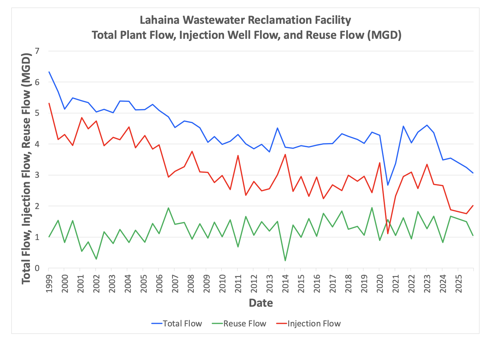 Total Flow Reuse Flow Injection Flow Total Nitrogen Total Phosphorus coliform Date MGD MGD MGD mg/L mg/L MPN/100mL 1/11/99 6.321 1.006 5.315 6.7 1.3 < 2 8/9/99 5.685 1.536 4.149 6.1 1.7 < 2 1/31/00 5.13 0.825 4.305 6.9 2 500 7/20/00 5.489 1.53 3.959 0.844 1.66 2 2/13/01 5.391 0.542 4.849 7.06 2.31 < 2 7/25/01 5.335 0.842 4.493 9.294 2.78 1600 1/29/02 5.032 0.294 4.738 7.12 2.03 2 7/19/02 5.12 1.171 3.949 5.63 1.37 70 2/4/03 5.01 0.794 4.216 6.8 0.391 240 7/17/03 5.386 1.248 4.138 5.6 0 70 2/6/04 5.378 0.826 4.552 5.92 1.24 17 7/16/04 5.1 1.222 3.878 4.33 0.26 110 2/7/05 5.11 0.837 4.273 2.4 0.45 4 8/9/05 5.275 1.435 3.84 4.29 0.24 500 1/27/06 5.087 1.111 3.976 3.48 0.22 > 1600 8/6/06 4.877 1.942 2.935 1.66 0.83 > 1600 1/22/07 4.532 1.414 3.118 3.75 1.58 900 8/8/07 4.741 1.47 3.271 2.25 0.61 > 1600 2/7/08 4.693 0.932 3.761 7.68 0.35 > 1600 8/4/08 4.526 1.425 3.101 15.37 0.33 240 2/13/09 4.055 0.97 3.085 4.54 0.22 > 1600 7/19/09 4.238 1.477 2.761 2.68 0.7 > 1600 01/15/10 3.991 1.009 2.982 2.783 0.7 540 07/19/10 4.091 1.555 2.536 5.32 0.42 540 01/12/11 4.308 0.682 3.626 3.06 0.3 110 07/25/11 4.008 1.659 2.349 5.56 0.26 540 01/23/12 3.849 1.058 2.791 7.6 0.35 < 1.8 07/10/12 3.985 1.497 2.488 5.24 0.43 2 01/03/13 3.744 1.19 2.554 7.52 1.51 > 1.8 07/15/13 4.519 1.506 3.013 7.89 0.65 < 1.8 01/24/14 3.897 0.236 3.661 3.19 0.74 > 1.8 07/23/14 3.865 1.389 2.476 4.28 0.45 < 1.8 01/12/15 3.943 0.99 2.953 5.41 0.26 > 1.8 07/27/15 3.908 1.592 2.316 7.22 1.1 < 1.8 01/15/16 3.962 1.029 2.933 7.26 0.7 2 06/15/16 4.004 1.762 2.242 4.55 0.34 1 01/26/17 4.014 1.331 2.683 4.69 0.53 1 08/07/17 4.336 1.835 2.501 6.03 0.49 < 1 01/31/18 4.248 1.254 2.994 4.62 0.39 < 1 08/09/18 4.149 1.345 2.804 5.9 0.44 < 1 01/29/19 4.02 1.063 2.957 4.57 0.47 < 1 07/29/19 4.379 1.944 2.435 7.37 1.4 < 1 01/17/20 4.285 0.889 3.396 4.7 0.481 6.3 07/16/20 2.676 1.565 1.111 5.723 3.36 < 1 01/07/21 3.372 1.049 2.323 5.26 0.098 < 1 07/14/21 4.572 1.624 2.948 6.28 0.216 < 1 01/19/22 4.04 0.944 3.096 6.85 0.352 < 1 06/28/22 4.386 1.822 2.564 5.631 1.9 < 1 01/13/23 4.609 1.265 3.344 3.21 1.25 1 06/23/23 4.368 1.672 2.696 6.69 2.1 < 1 01/18/24 3.486 0.825 2.661 5.928 3.7 < 1 07/19/24 3.544 1.668 1.876 5.411 1.6 < 1 07/11/25 3.242 1.491 1.751 4.69 2.15 < 1 12/24/25 3.065 1.048 2.017 7.03 2.52 < 1